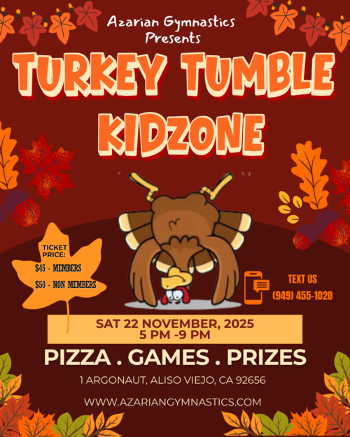 Get ready for a fantastic fun-filled event at Azarian Gymnastics in Aliso Viejo! Join us on Saturday, November 22, 2025, from 5 PM to 9 PM for the Turkey Tumble Kidzone — a lively 4-hour celebration packed with excitement and creativity for kids from 3yrs-12yrs.
