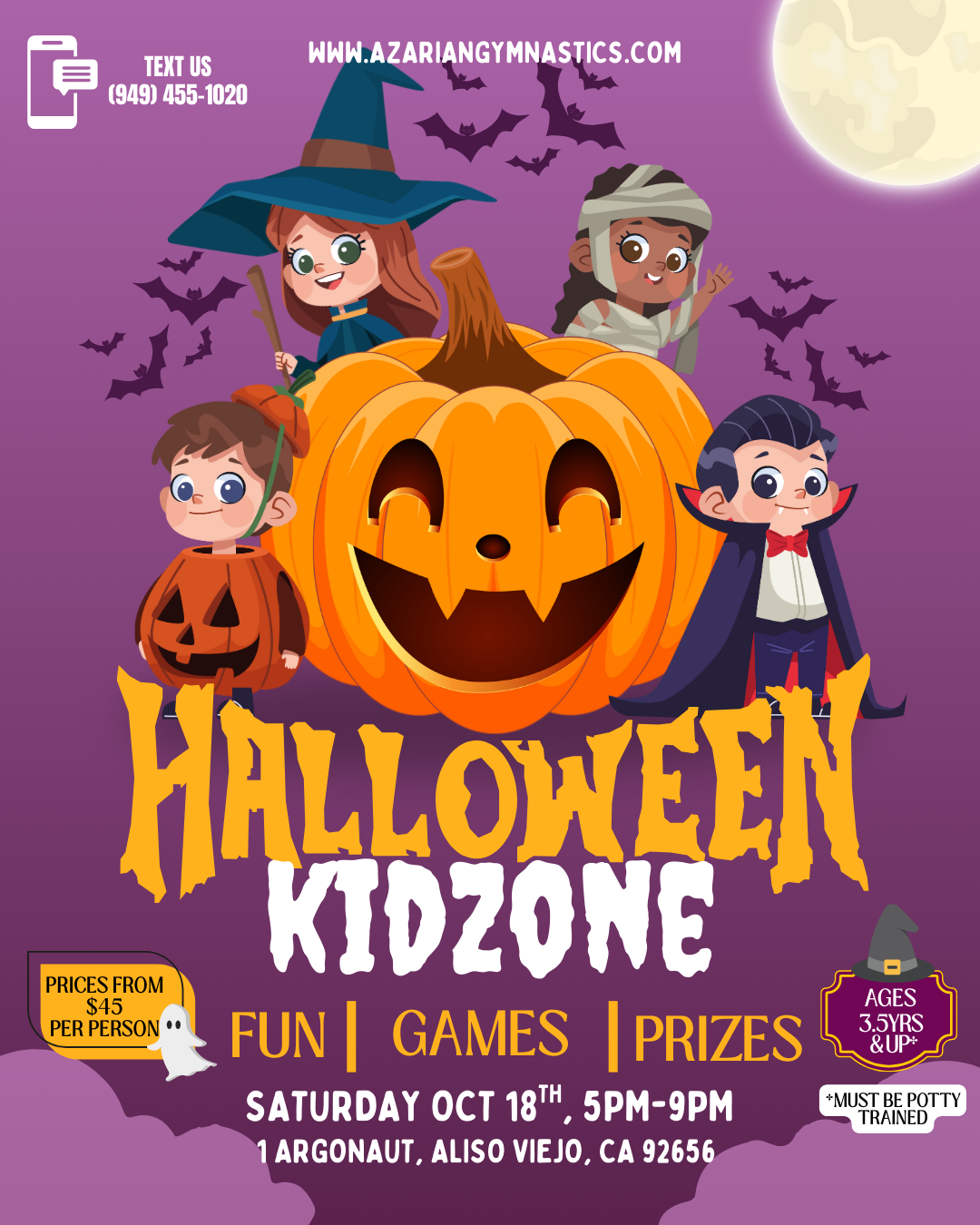 This October 18th, let the little monsters and witches in your life shine at our Halloween Kidzone—a night of trick-or-treating, spooky giggles, and unforgettable memories! From 5 PM to 9 PM at Azarian Gymnastics (1 Argonaut, Aliso Viejo), kids aged 3.5+ (and potty-trained) can dive into a haunted haven of Halloween magic while parents savor a well-earned evening off.